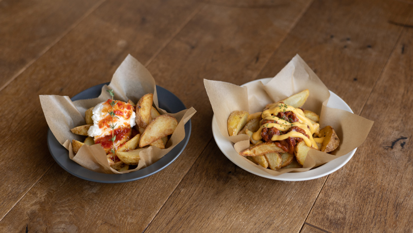 ゴロゴロ食感のチリコンカンと濃厚チェダーチーズソースを合わせた食べ応えのある一品です。