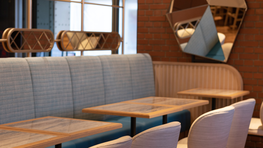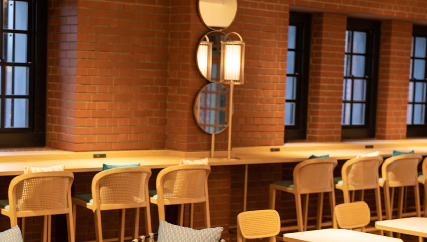 「UNI COFFEE ROASTERY 横浜赤レンガ倉庫」でも、赤レンガの風合いを活かし、ビンテージ感ある色合い、インテリアをチョイス。歴史ある横浜赤レンガ倉庫のリニューアルにあわせて、”古くて新しい”空間に仕上げました。