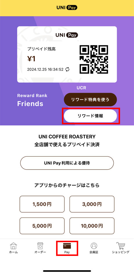 1.下部メニューから「Pay」をタップ後、画面中段の「リワード情報」をタップ