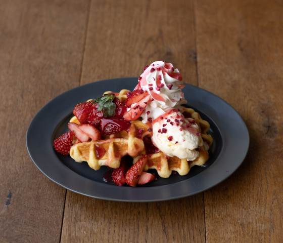 甘酸っぱいベリーソースに濃厚なバニラアイス、ストロベリーを添えた温かいワッフルです。